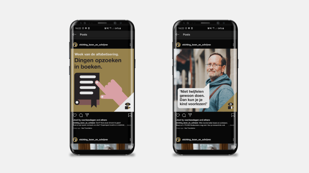 The new identity has helped Stichting Lezen en Schrijven express its mission more powerfully. Since its introduction, brand awareness has increased by 5% and theme awareness by 8% (2019–2022).