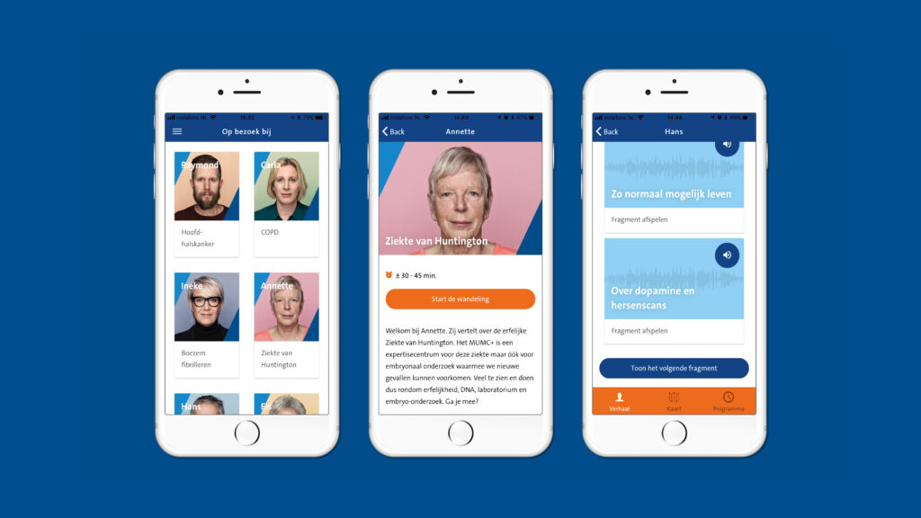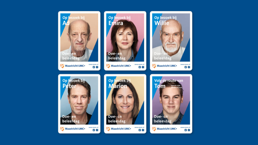 Zes waargebeurde medische verhalen van patiënten vormen de ruggengraat van de Doe- en Beleefdag. Bezoekers stappen als het ware in hun schoenen, van diagnose tot behandeling en nazorg. Via een speciaal ontwikkelde app, routemarkeringen op de vloeren en audiofragmenten volgen zij de route van een patiënt, langs plekken waar men normaal niet snel komt. Op elk tussenstation komen disciplines, technologie en medewerkers samen. Zo ontstaat een ervaring die persoonlijk, interactief en écht is. De verhalen geven een gezicht aan abstracte thema’s als wetenschap, preventie en innovatie, en maakten voelbaar wat Maastricht UMC+ uniek maakt: een universitair medisch centrum waar zorg, onderzoek en onderwijs elkaar raken in menselijkheid.